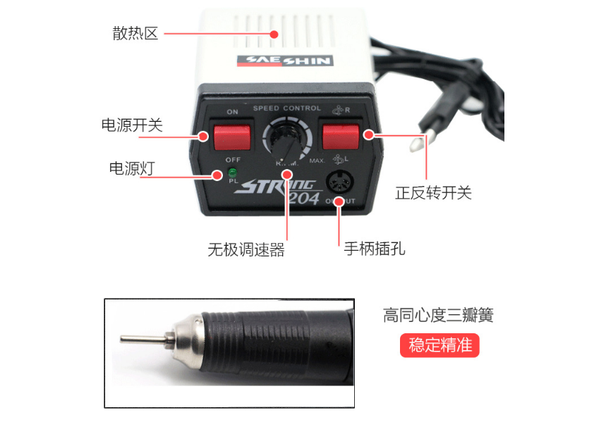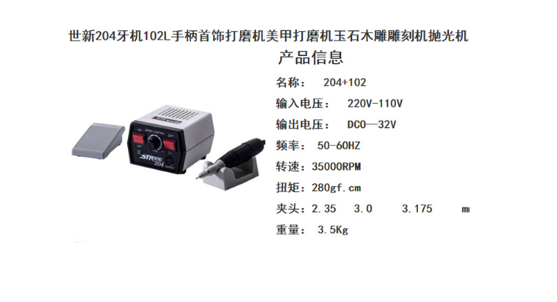 韓國世新204-102L電動打磨機牙機 首飾打磨機 美甲打磨機 玉石雕刻機拋光機,輕便式筆狀結構性設計,具有小體積,高轉速、低噪聲、大力矩、耗氣量低、輕巧平穩(wěn)(抖晃率極低)等特性,其操作簡便、作業(yè)快速方便,廣泛應用于各種模具(鞋模、輪胎模、筆模、各類高低壓電器、家用電器模具、塑殼開關模具等)、五金制品(水龍頭、拉鏈、五金工具及各類成套設備葙體等)、及玻璃、石材、工藝品、手飾、線路板制造等等一切需要毛坯修整、切削、研磨、雕刻、修整、及需鏡面拋光作業(yè)的行業(yè)。